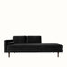 The minimalist structure gives the piece an architectural presence, while the generous seat depth allows it to function comfortably as both a chaise sofa and a daybed. Two back cushions and a cylindrical bolster cushion provide supportive comfort without interrupting the sofa’s streamlined form.