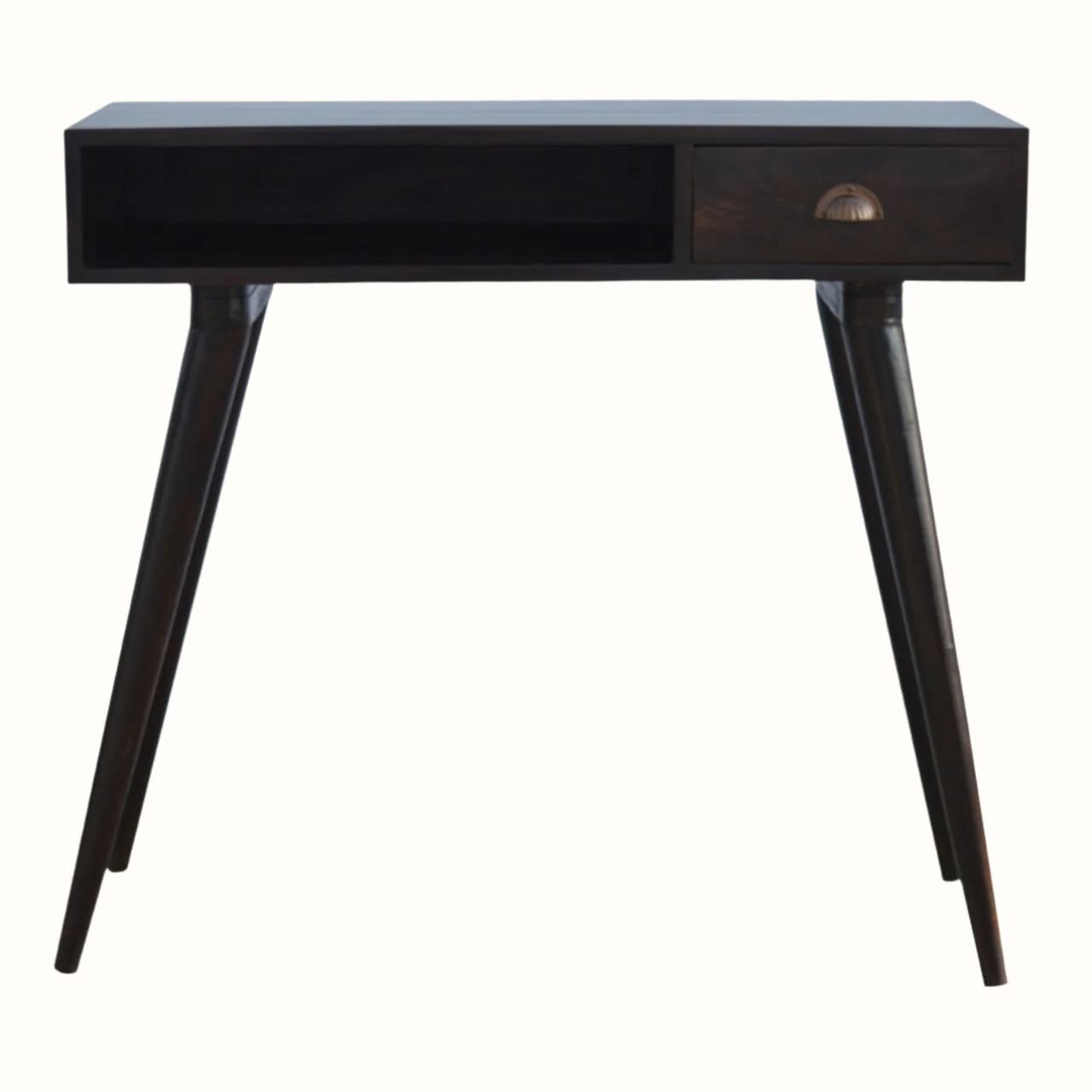 Stylish and versatile, Ellis blends coastal and Scandinavian design elements to create a collection of charm-filled desks. The Ellis open desk is compact and functional. An ample tabletop, single spacious drawer, and open slot shelf provide plenty of room for stationery, a laptop, and other home office essentials. Set on four tapered legs, it’s handcrafted from solid mango wood in a walnut finish. Complete with brass shell handles, this beautiful desk will motivate you to work.