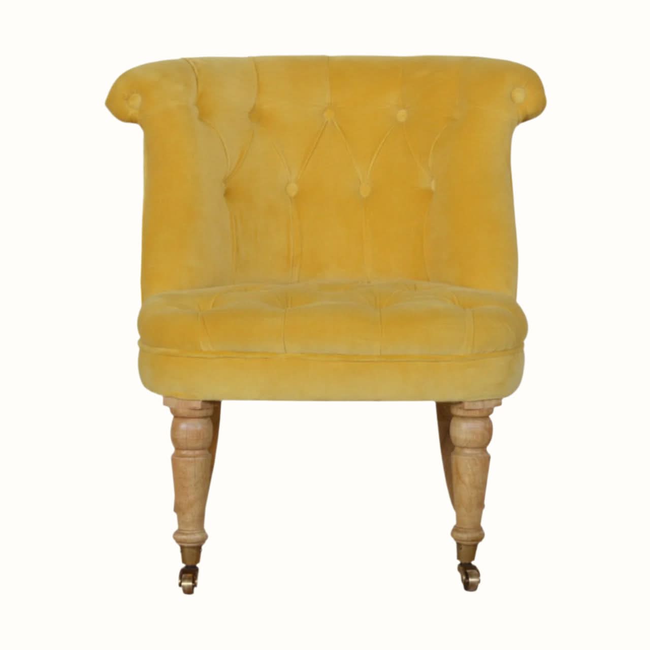 A contemporary take on a classic style, Mineo is both chic and timeless. Handcrafted from solid mango wood in a natural finish, each chair is upholstered in a soft mustard yellow cotton velvet fabric. The perfect statement piece to transform your living room or bedroom setup. Created to a premium standard, deep button tufts, two caster legs at the front, and two tapered legs at the back create a luxurious look.