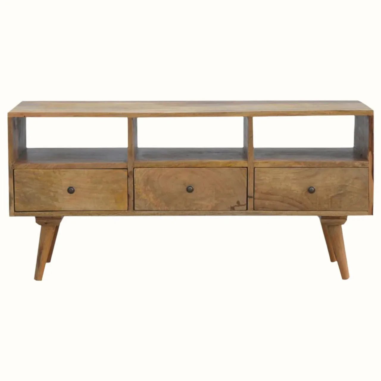 Elegant, timeless and beautifully made, the Fogel Open Triple TV Stand is handcrafted from solid mango wood and finished in a light natural stain that brings out the natural grain. Designed for storage and display, it features three drawers and three open shelves, perfect for organising media devices, game consoles, vinyl players, and accessories. Its versatile shape makes it an attractive alternative for a record player unit or plant display stand. It is a strong piece that suits modern and classic interiors and adds warmth and character to any living space.