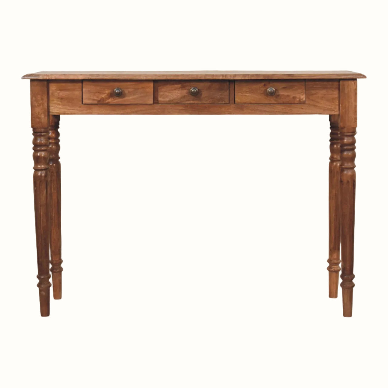 A substantial three-drawer console with classic turned detailing and solid wood build.
