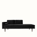 The Wind Chaise Longue by Broste Copenhagen offers a refined take on contemporary Scandinavian seating. Upholstered in black velvet, the design features a clean, low-profile silhouette with a single armrest and an extended chaise for relaxed lounging.