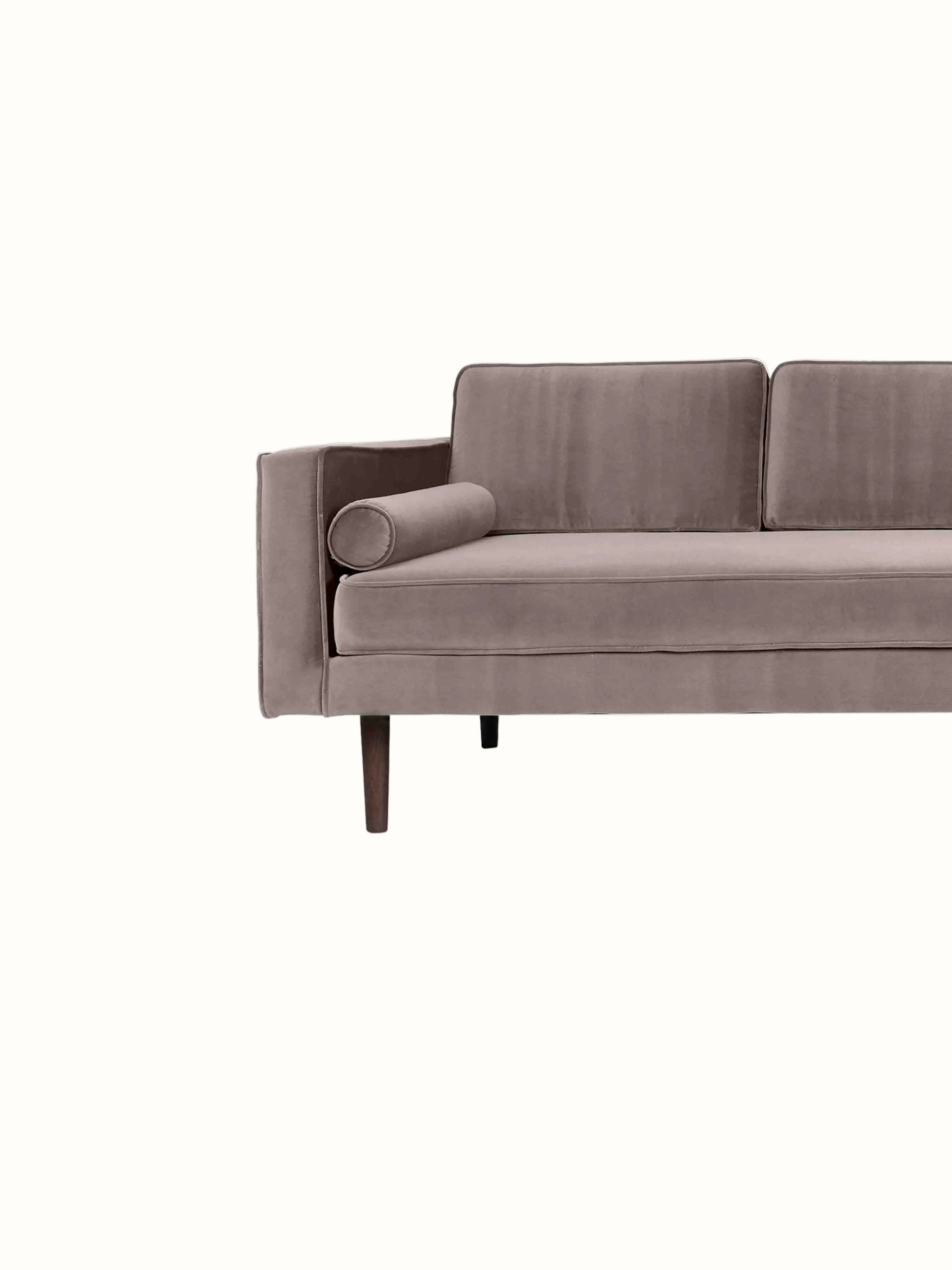 The minimalist structure gives the piece an architectural presence, while the generous seat depth allows it to function comfortably as both a chaise sofa and a daybed. Two back cushions and a cylindrical bolster cushion provide supportive comfort without interrupting the sofa’s streamlined form.