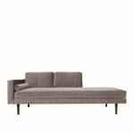 A luxurious chaise longue sofa from Broste Copenhagen with a modern Scandinavian silhouette. Built on a solid wood frame and available in a selection of velvet finishes.