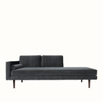 The Wind Chaise Longue by Broste Copenhagen offers a refined take on contemporary Scandinavian seating. Upholstered in a magnet grey velvet, the design features a clean, low-profile silhouette with a single armrest and an extended chaise for relaxed lounging.