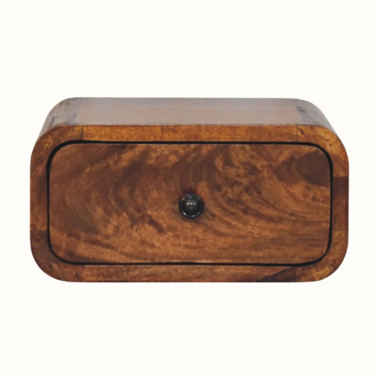 The Babu wall-mounted bedside table combines style and functionality, providing practical storage for your bedroom. Each bedside is handcrafted from solid mango wood in a chestnut finish. A simple curved silhouette offers an elegant and timeless look. A single drawer provides plenty of storage space for nighttime essentials. Brass hardware provide a high-end look, while a wall-mounted design saves space and adds a contemporary touch. Versatile in design, pair this bedside with our other collections for a cohesive look in your home. The Babu bedside is also available in a medium size or a freestanding design.