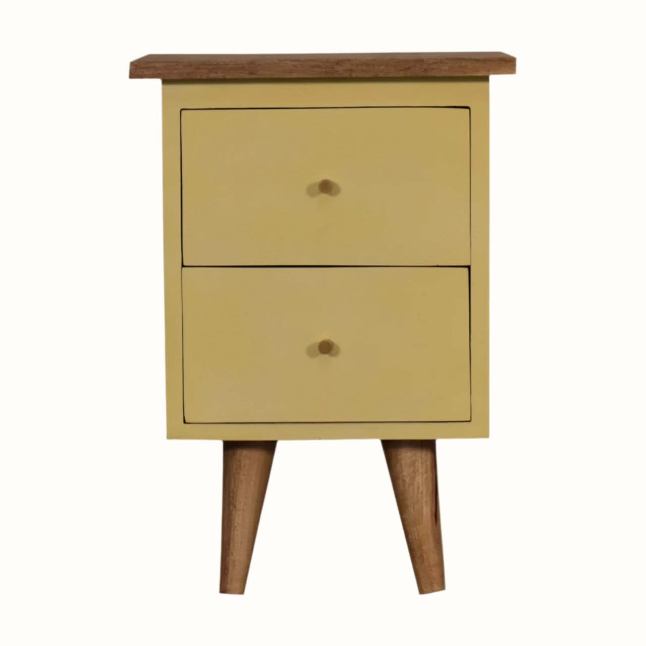 Cline is the perfect bedside table for small spaces. Each bedside is beautifully handcrafted in a natural finish from solid mango wood, and hand painted in yellow. Four short tapered legs and brass hardware add a high-end look. Keep nighttime essentials within arm's reach with two drawers and a compact tabletop.