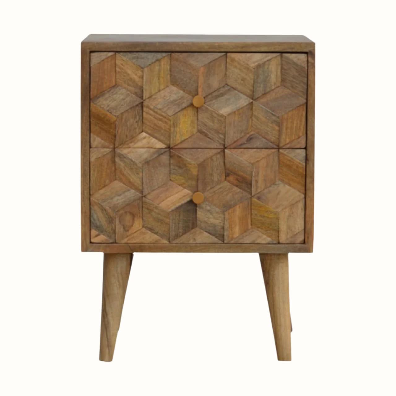 Want to create a luxury feel at home without breaking the bank? Felix is the epitome of sophistication. Handcrafted from mango wood in a natural finish, the Felix Bedside Table features a textured cube-carved design. Two spacious drawers provide plentiful storage space for books and other dreamy nighttime essentials. Four Nordic-style legs and brass knob detailing give the design an elegant look. Also, style outside the bedroom as a side table, lamp stand, or plant stand.