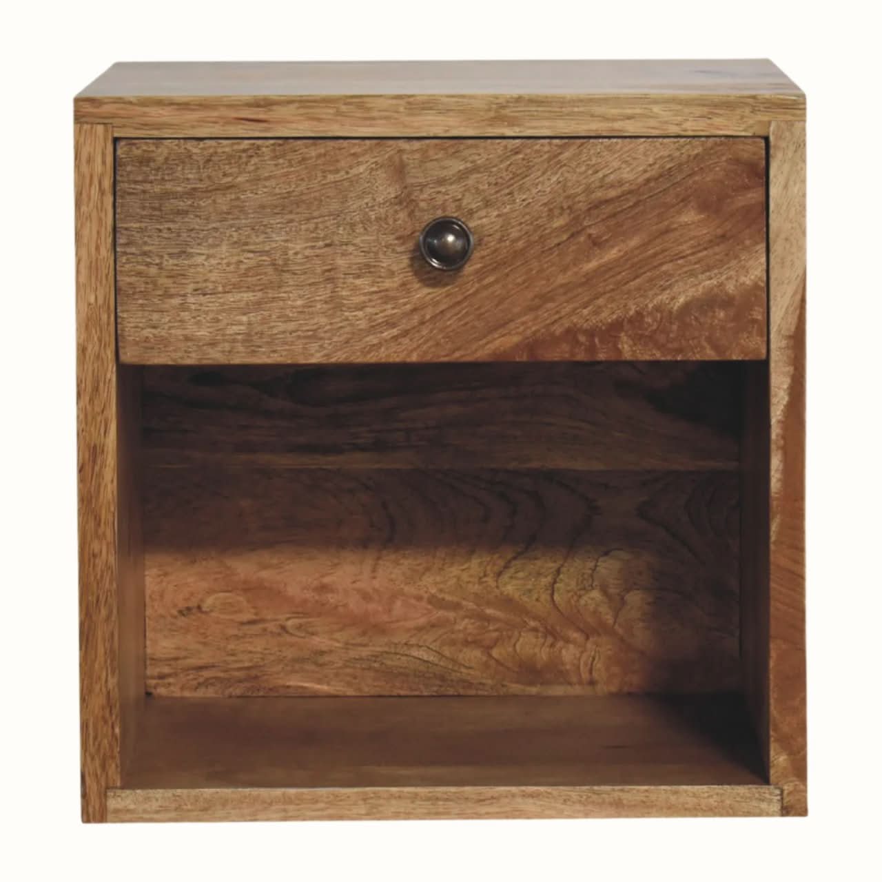 Classy, timeless and versatile. Say hi to our Fogel collection. The Fogel wall-mounted bedside table is handcrafted from durable solid mango wood in a natural finish. One drawer and an open slot shelf provide handy storage space for dreamy nighttime essentials. Each piece is finished with a brass knob. The wall-mounted design is perfect for small spaces and those looking to save space.