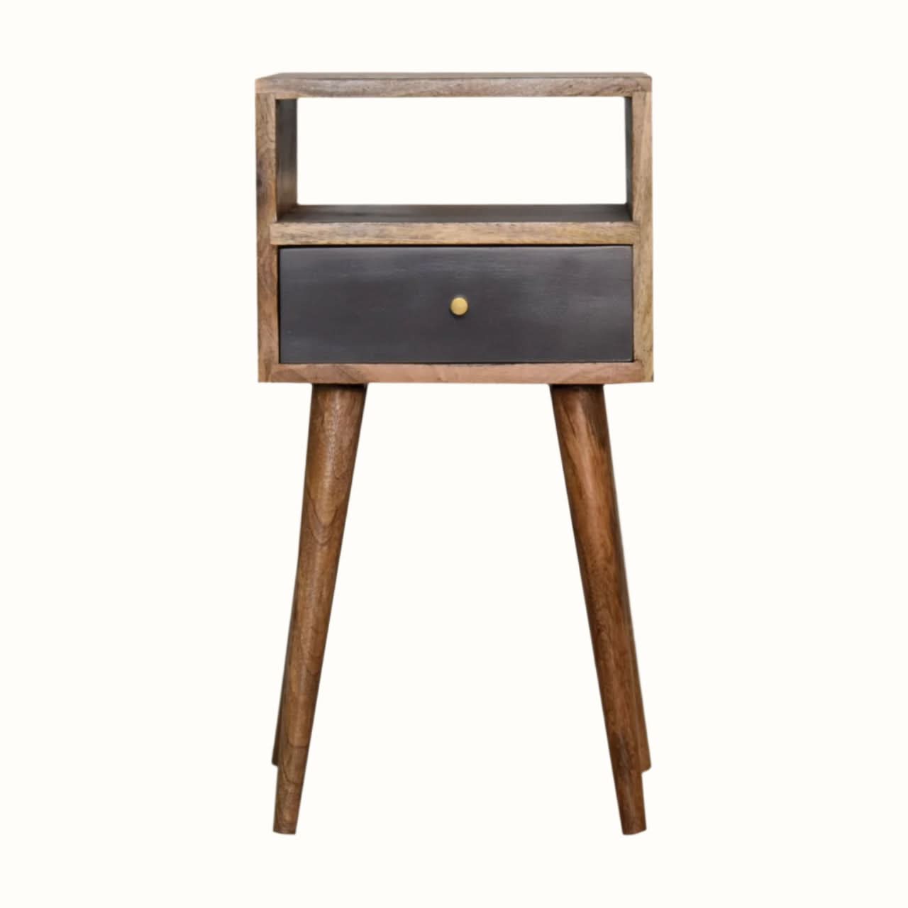 Created for small spaces, Littler is petite in size and functional in design. Each piece is beautifully handcrafted from sustainably sourced mango wood in a natural and hand-painted slate grey finish. The pullout drawer, open shelf, and petite tabletop provide plenty of room for a chic lamp and other nighttime essentials. Long Nordic-Style tapered legs, and brass knob hardware create a premium look. Incredibly versatile, Littler will suit any home and style outside the bedroom as a side table in your living space.