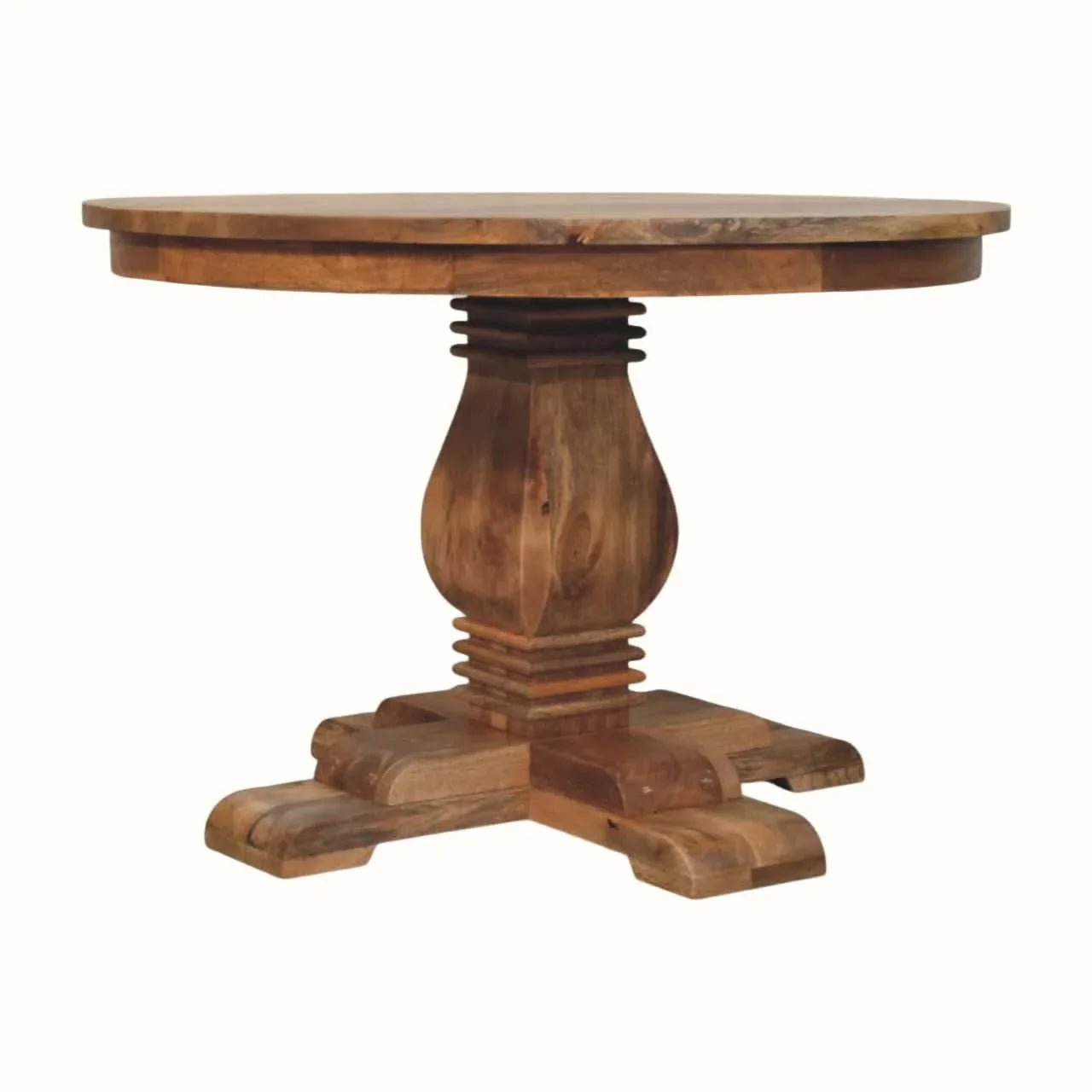 The Rowen Round Dining Table is a beautiful addition to any dining space, blending graceful curves with timeless elegance. Made from solid mango wood, this table boasts a sturdy and distinctive pedestal base that lends it character. The round tabletop creates a warm and inviting setting, perfect for enjoying meals and spending time with family and friends.