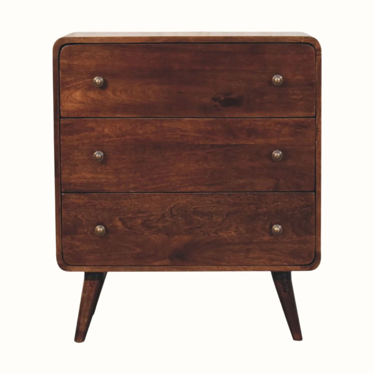 Inspired by Scandinavian design, Hamade merges style and functionality, offering timeless pieces that bring both beauty and purpose to your space. Designed to withstand the test of time, the Hamade chest of drawers is beautifully handcrafted from solid mango wood in a california walnut finish. Three drawers finished with brass knobs open to plenty of storage space for keeping your jewellery, clothes, towels, and other belongings out of sight. Incredibly versatile, style it inside or outside the bedroom.