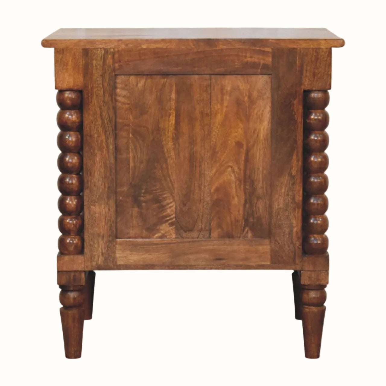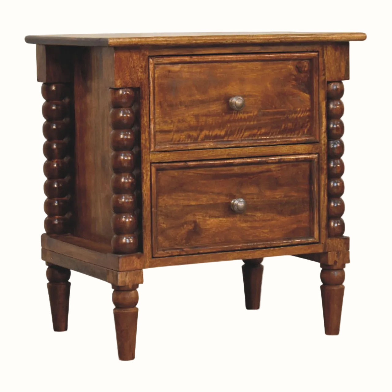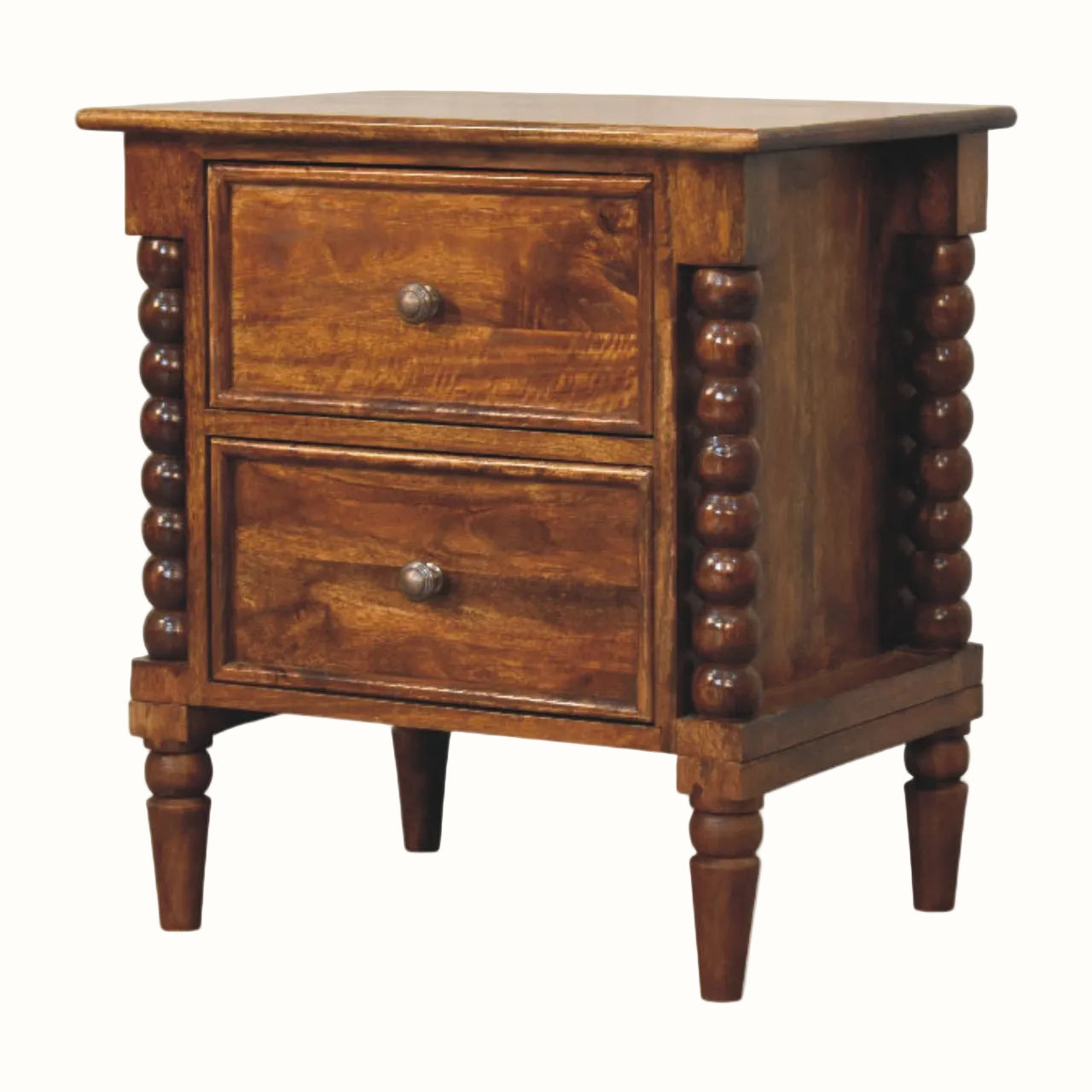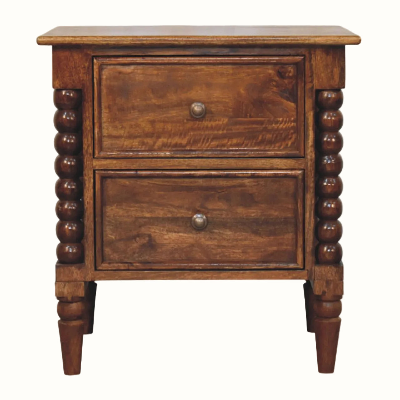 Hand-carved spindle-turned legs introduce subtle character, while the clean, well-proportioned body keeps the design feeling calm and versatile. Two generously sized drawers, each finished with brass knobs, provide ample storage for nighttime essentials, helping to keep the bedside organised and uncluttered.